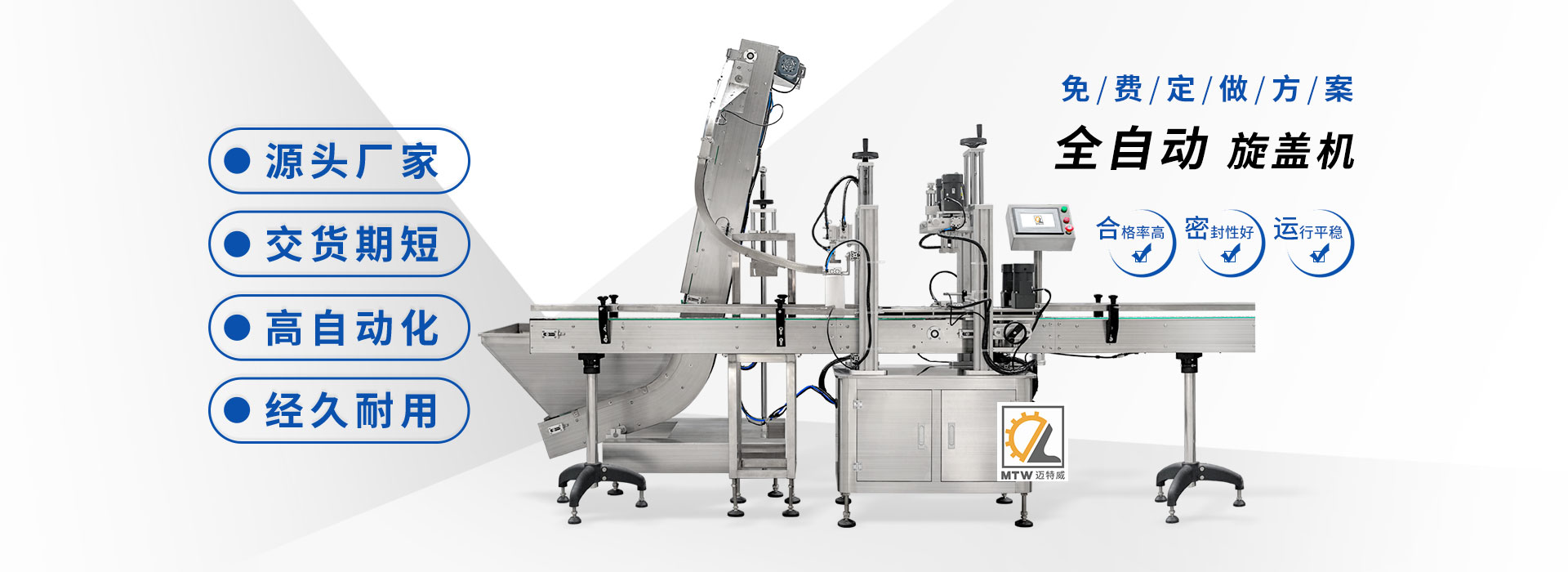 邁特威自動化設(shè)備(天津)有限公司坐落于素有京津明珠之稱的天津·武清區(qū),是國家高新技術(shù)企業(yè),專注生產(chǎn)、研發(fā)、銷售全自動灌裝機(jī)、旋蓋機(jī)、封口機(jī)、貼標(biāo)機(jī)等系列產(chǎn)品,立足京津冀、服務(wù)全國,遠(yuǎn)銷海內(nèi)外,團(tuán)隊(duì)由行業(yè)高技術(shù)人士組成,為國內(nèi)外食品、日化、糧油、醫(yī)藥等企業(yè)提供滿意的包裝解決方案。 查看詳情